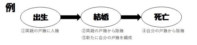 出生、婚姻、離婚、死亡等のライフイベントや、戸籍法の改正により、既存の戸籍への入籍や今までの戸籍からの除籍、新たな戸籍の編製などが行われます。