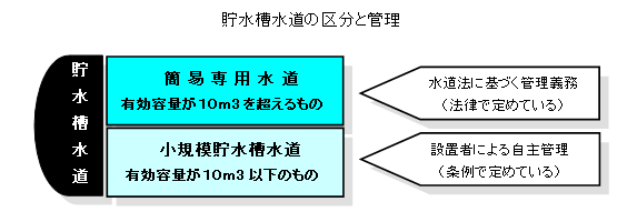 ※「小規模貯水槽水道」は法制上の用語ではありませんが、貯水槽水道のうち、簡易専用水道以外のもの(10立方メートル以下)をわかり易く、こう呼んでいます。