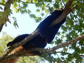 レッサーパンダのシンゲンはオオモミジの枝で器用にたれています。
